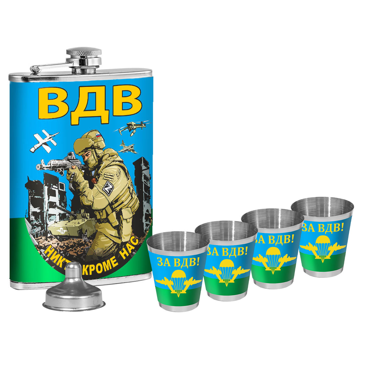 Подарочный набор с фляжкой и стопками ВДВ Никто кроме нас (260 мл, 4х50 мл) можно купить от 2 500 руб., Армейские фляжки в Атрибутии с доставкой по РФ