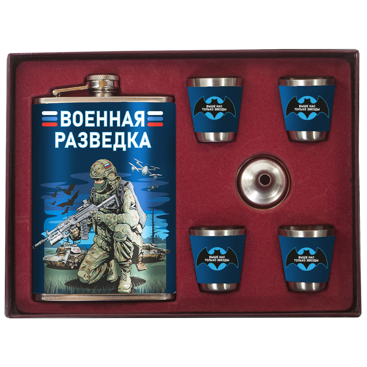 Подарочный набор с фляжкой и стопками Военная разведка Выше нас только звезды (260 мл, 4х50 мл) можно купить от 2 500 руб., Армейские фляжки в Атрибутии с доставкой по РФ